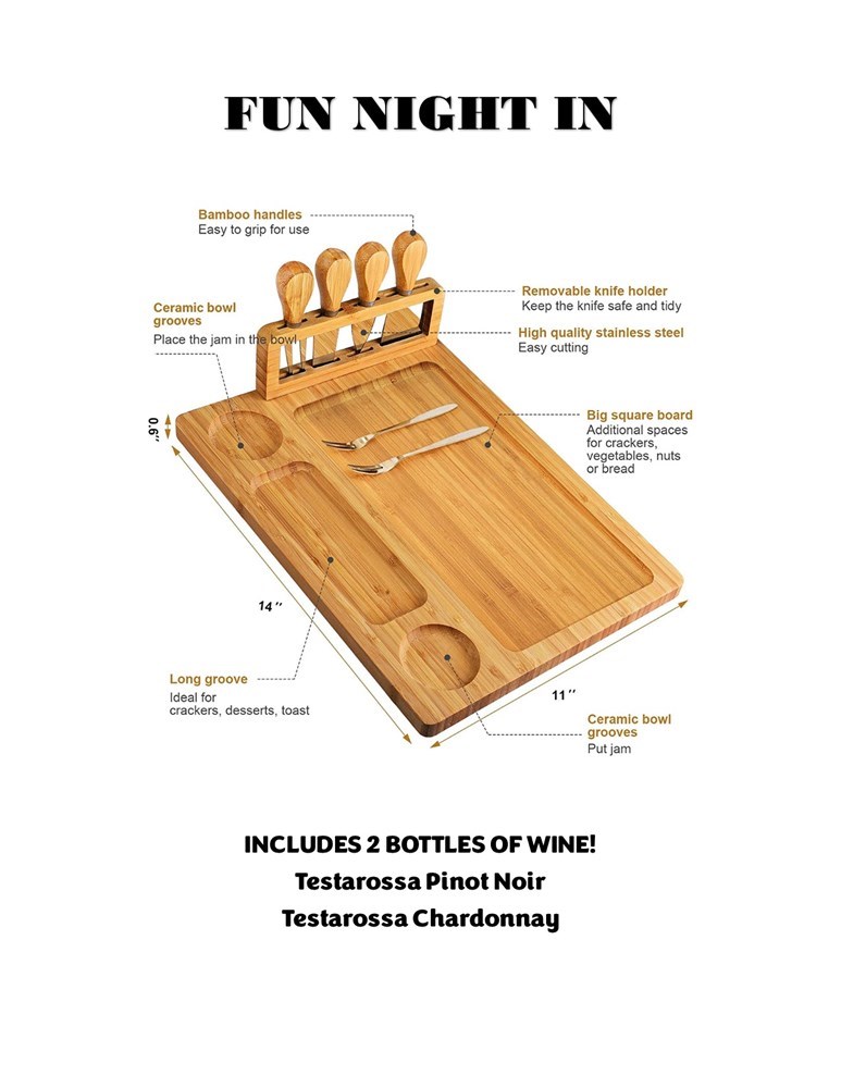 Fun Night In! This kit includes a bamboo charcuterie board and 2 bottles of wine: Testarossa Chardonnay and Testarossa Pinot Noir.