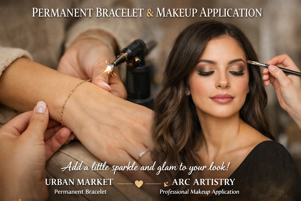 Add a little sparkle and glam to your look with this stylish duo! Enjoy one permanent bracelet from Urban Market — a custom-fit, clasp-free piece of jewelry that’s welded on for a seamless, everyday shine. Perfect for celebrating a friendship, milestone, or simply treating yourself to a trendy accessory you’ll never want to take off. Then get event-ready with a professional makeup application from ARC Artistry by Angela Culver. Whether you’re heading to a special occasion, date night, or just want to feel your best, you’ll leave glowing with a flawless, confidence-boosting look. Shine bright with this beauty and style package — the perfect treat for yourself or someone special! ✨