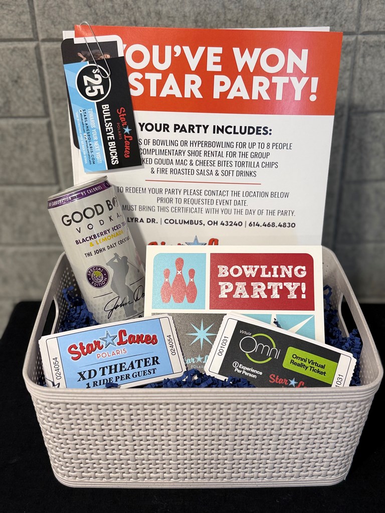Star Lanes Polaris – Star Party Package! Get ready to roll, play, and celebrate with the ultimate group night out at Star Lanes Polaris! This Star Party Certificate Basket delivers hours of high-energy fun for up to eight (8) guests. 🎳 2 hours of Bowling or HyperBowling on one lane (includes shoe rentals) 🥤 Unlimited soft drinks 🧀 Two shareable appetizers:Smoked Gouda Mac & Cheese Bites & Tortilla Chips with Fire-Roasted Salsa 🎯 $25 in Bullseye Bucks for the dart bays 🎬 8 XD Theater ride tickets 🥽 8 Omni Virtual Reality Arena tickets 🎮 8 one-hour Time Play Arcade Game Cards (non-redemption) Perfect for birthdays, team celebrations, family nights, or just an unforgettable evening out! ⭐ Valid Monday–Thursday, 11am–11pm. Not valid 11/15–1/1. Expires one year from date of donation. Bid high and let the good times roll!