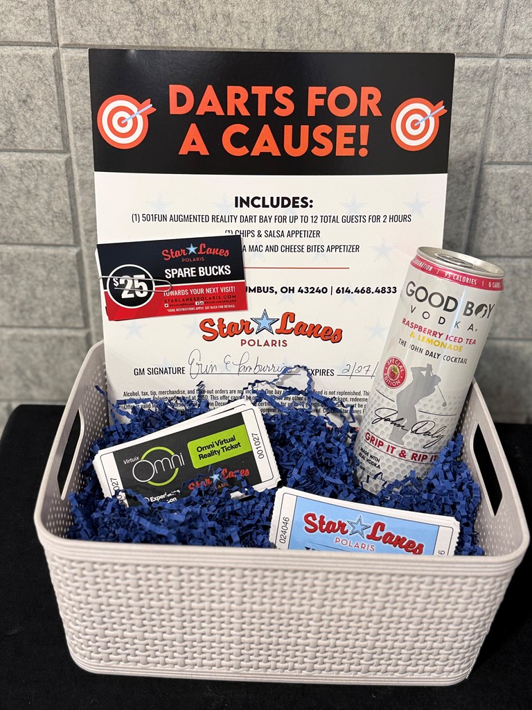 Take your celebration to the next level with an action-packed experience at Star Lanes Polaris. This Darts for a Cause Certificate Basket is perfect for team outings, birthday parties, or a high-energy night out with friends. Package includes: 🎯 2 hours of Augmented Reality Dart Bay time for up to 12 guests on one dart bay 🥤 Unlimited soft drinks 🧀 Two shareable appetizers 🎳 $25 in SpareBucks toward bowling 🎬 12 XD Theater ride tickets 🥽 12 Omni Virtual Reality Arena tickets 🎮 12 one-hour Time Play Arcade Game Cards (non-redemption) Interactive darts, immersive virtual reality, arcade play, & great food = nonstop fun all in one place Terms: Valid Monday–Thursday, 11am–11pm. Not available 11/15–1/1. Expires March 2027.