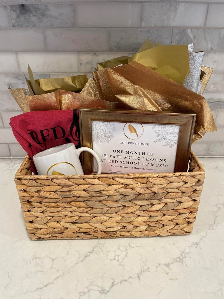 Inspire a love of music with this fun and enriching bundle from Red School of Music! This package includes a gift certificate for one month of private music lessons at the Hilliard or Marysville location — perfect for beginners ready to explore a new instrument or experienced musicians looking to sharpen their skills. With personalized instruction from talented teachers, students of all ages can build confidence, creativity, and a lifelong appreciation for music. The bundle also includes a Red School of Music branded T-shirt and mug, all beautifully arranged in a gift basket — making it a thoughtful and inspiring gift for any aspiring musician. Bid high and let the music begin! 🎶