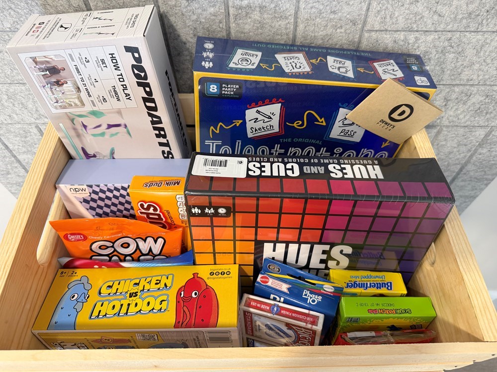 Bring on the laughs, friendly competition, and unforgettable memories with this ultimate Family Game Night Basket! This bundle is packed with crowd-pleasing favorites, including Chicken vs. Hot Dog for silly, fast-paced fun and Telestrations for laugh-out-loud drawing and guessing moments. Test your color savvy with Hues & Cues, sharpen your aim with Pop Darts, and keep classic competition alive with poker chips and playing cards for endless game options. To top it all off, enjoy $25 to Dewey's Pizza and a selection of snacks to keep everyone fueled from the first round to the final victory. Perfect for families, friend groups, or anyone who loves a little playful rivalry — this basket guarantees a night full of laughter and connection. Game on! 🎲🎉