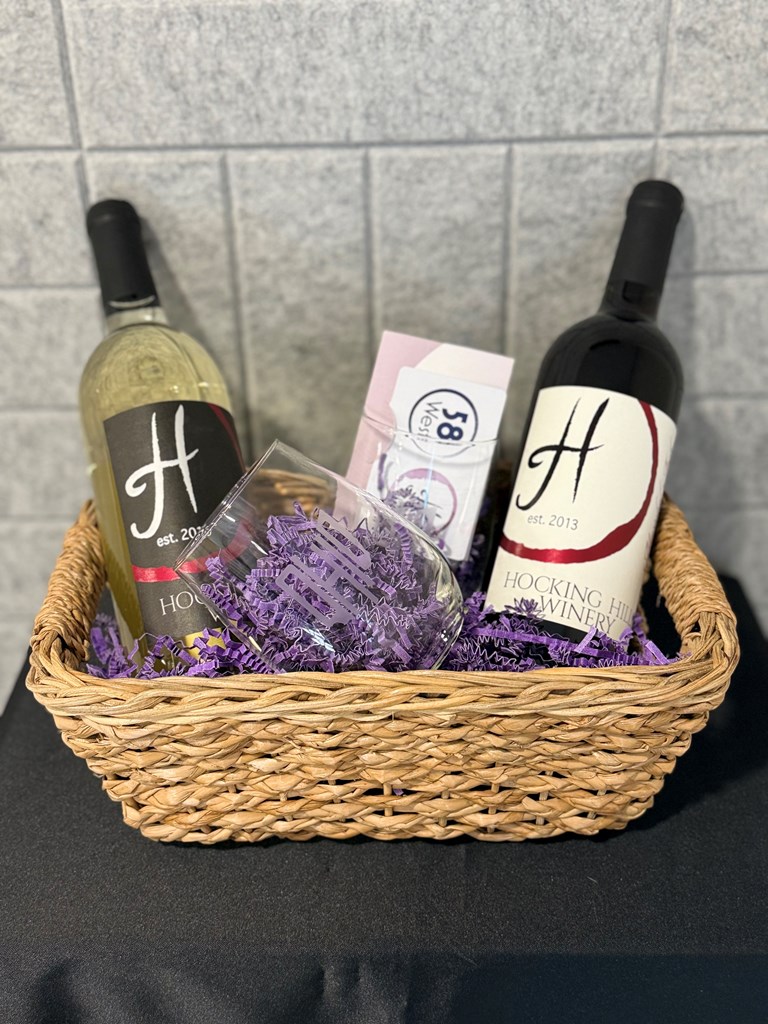Savor the beauty and flavor of Ohio wine country with this charming winery-inspired package. Enjoy a curated selection of wine from Hocking Hills Winery, known for its scenic setting and handcrafted wines. Whether you prefer bold reds, crisp whites, or something sweet and smooth, this basket brings a taste of Hocking Hills right to your home. Included is a gift card to use toward a future visit — perfect for planning a relaxing afternoon getaway — along with custom etched wine glasses to elevate every pour. Includes two (2) hand-etched custom wine glasses from CraftMan Creations. Ideal for date nights, girls’ nights, or a quiet evening in, this package is a toast to great wine and even better company. 🍷✨